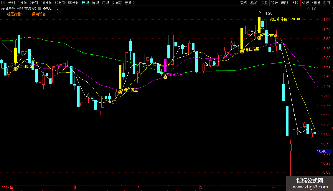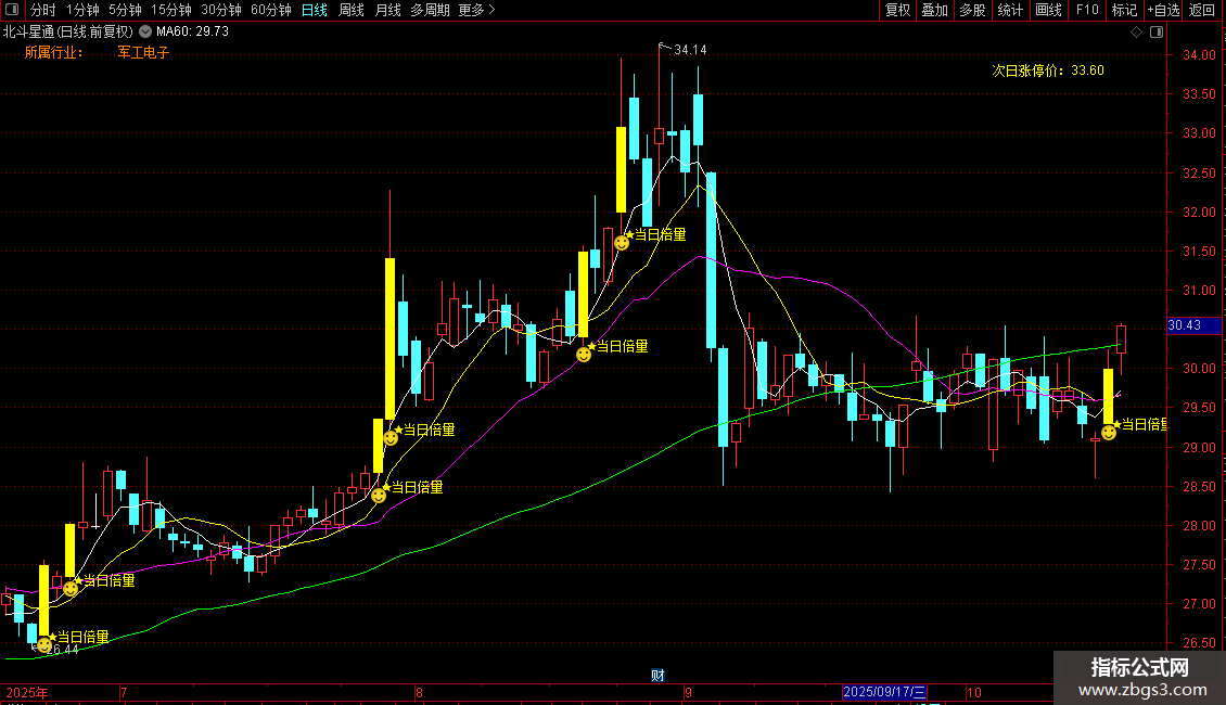 DRAWTEXT(倍量条件 AND NOT(游资信号),L*1,' ★当日倍量'),COLORYELLOW;