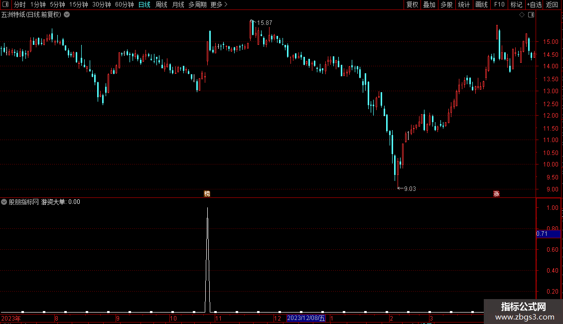 游资信号赋值:五高值=支撑线ANDBARSLAST(支撑条件)<=4AND交易天数AND收盘价>=OANDV>=1日前的成交量(手)*2ANDC/1日前的收盘价>1.03的5日过滤