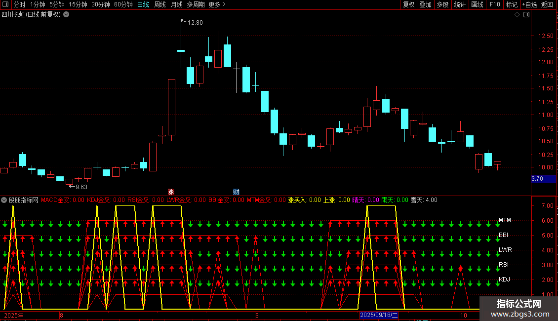 雨天:BARSLASTCOUNT(MACD金叉+KDJ金叉+RSI金叉+LWR金叉+BBI金叉+MTM金叉>0 AND MACD金叉+KDJ金叉+RSI金叉+LWR金叉+BBI金叉+MTM金叉<21 ),LINETHICK0;