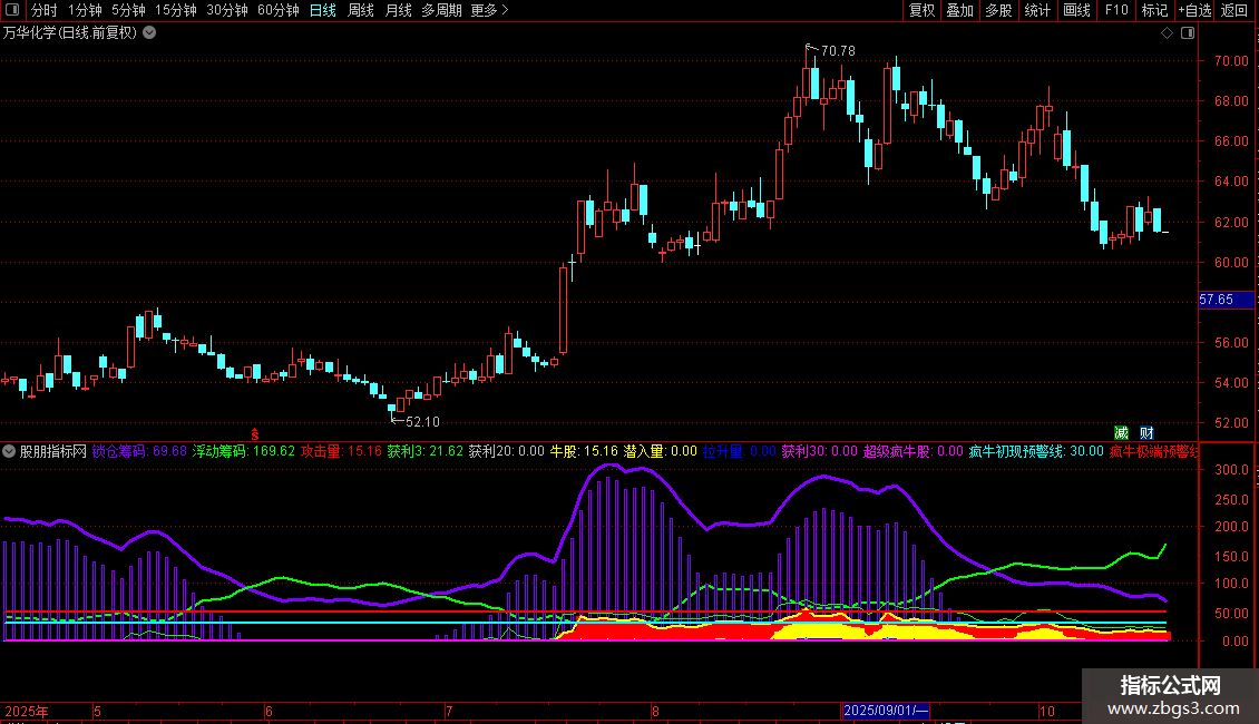 当满足条件获利30>20时,在超级疯牛股和0位置之间画柱状线,宽度为3.5,0不为0则画空心柱.,COLORFF00FF,线宽为3
