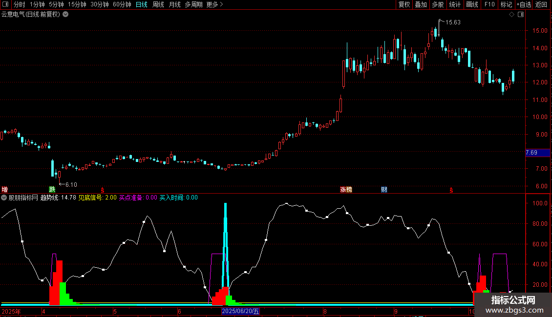 买入时间: IF(CROSS(趋势线,见底信号),100,0),COLORCYAN,LINETHICK4;