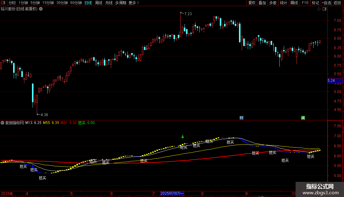 OPEN>REF(CLOSE,1),1,0),LOW,'买进'), COLORRED;