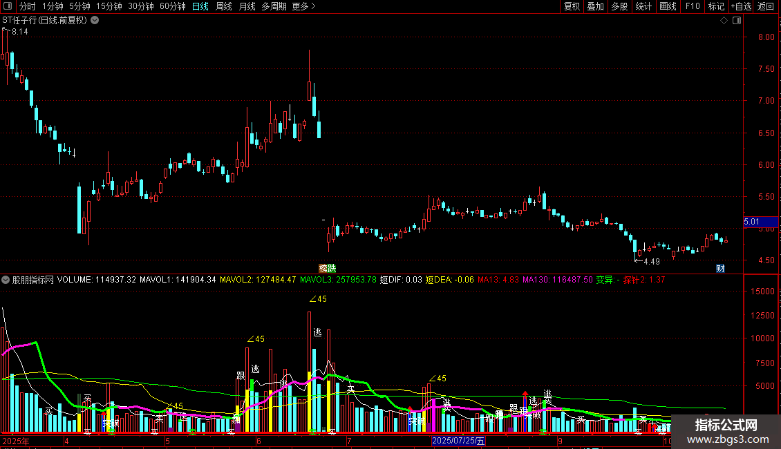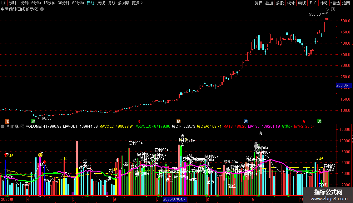 变异:IF(MA(X1,13)>MA(X1,5),MA(VOL,13),DRAWNULL),COLOR00FF00,LINETHICK3;