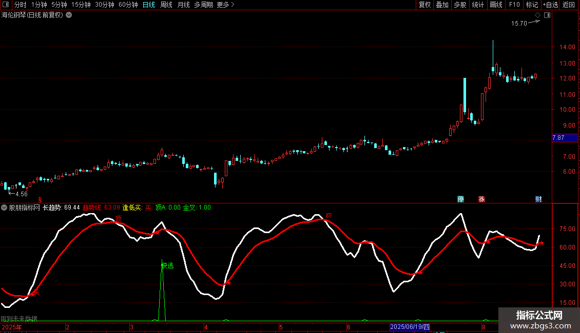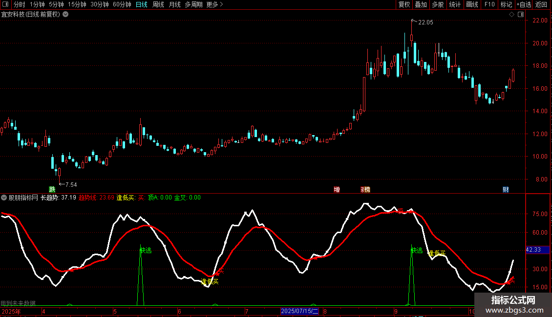 逢低买: DRAWTEXT(REF(CROSS(趋势线,长趋势),82) AND 趋势线>1.3*长趋势,长趋势,'逢低买'),COLOR00FFFF, LINETHICK1;