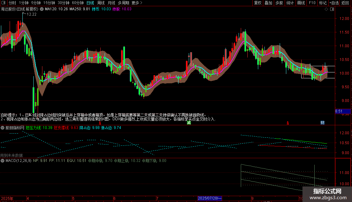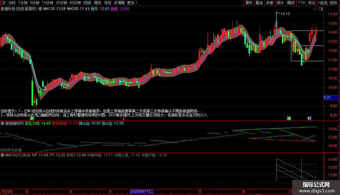 DRAWTEXT_FIX(ISLASTBAR,0,0.92,0,'泊砂提示:1、日K线对降△边线的突破后并上穿箱中或者箱顶,如是上穿箱底要等第二天或第三天持续确认不再跌破趋势线,.'),COLORWHITE;