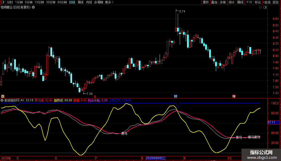 黑马线:EMA(A1,5),LINETHICK2,COLOR6600FF;
