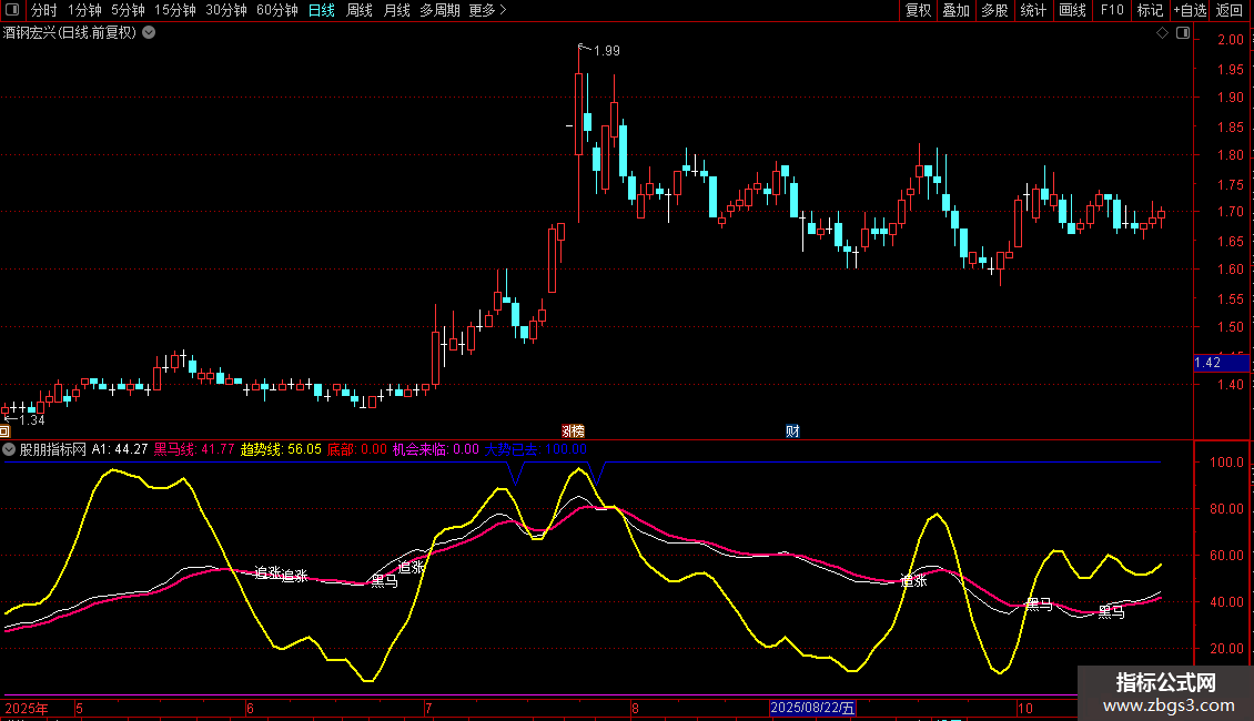 输出黑马线:A1的5日指数移动平均,线宽为2,COLOR6600FF