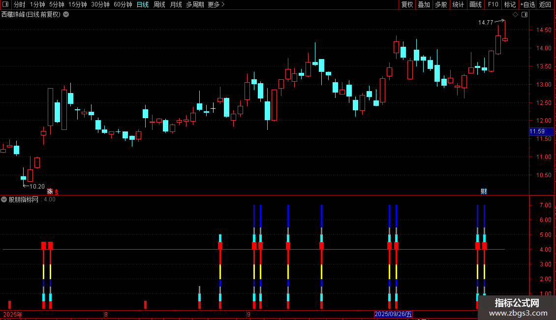 指标通过计算不同周期内的价格高低点,识别突破性买入信号并给出强度分级。当价格突破近期关键位置且开盘表现强势时,系统会通过彩色柱状图显示不同等级的做多信号,红色柱通常代表最强信号。操作上可在出现高强度彩色柱时关注,并结合量价关系确认信号有效性。
