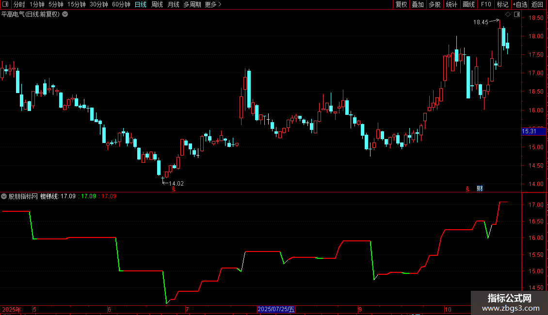 IF(楼梯线<=REF(楼梯线,1),楼梯线,DRAWNULL),COLORGREEN,LINETHICK2;