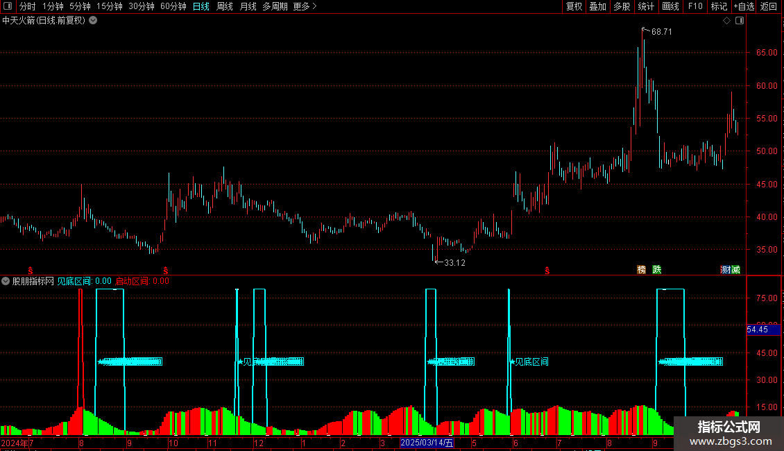 指标通过计算价格在近期高低点之间的相对位置,判断股票的底部和启动信号。主要功能是识别两种关键时机:当股价长期弱势后出现企稳迹象时标记为“见底区间”;当股价连续走强且动量充足时标记为“启动区间”。操作策略是在见底区间关注潜在反转机会,在启动区间考虑跟进。
