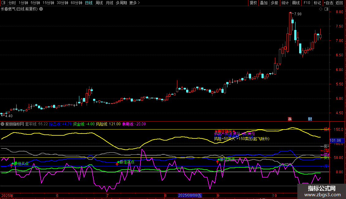 DRAWTEXT_FIX(1,0.65,0.14,0,'风险<50买入 >150卖出(起飞除外)'),COLORYELLOW;