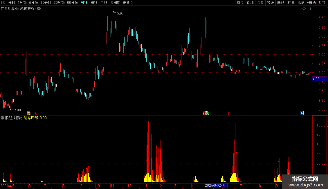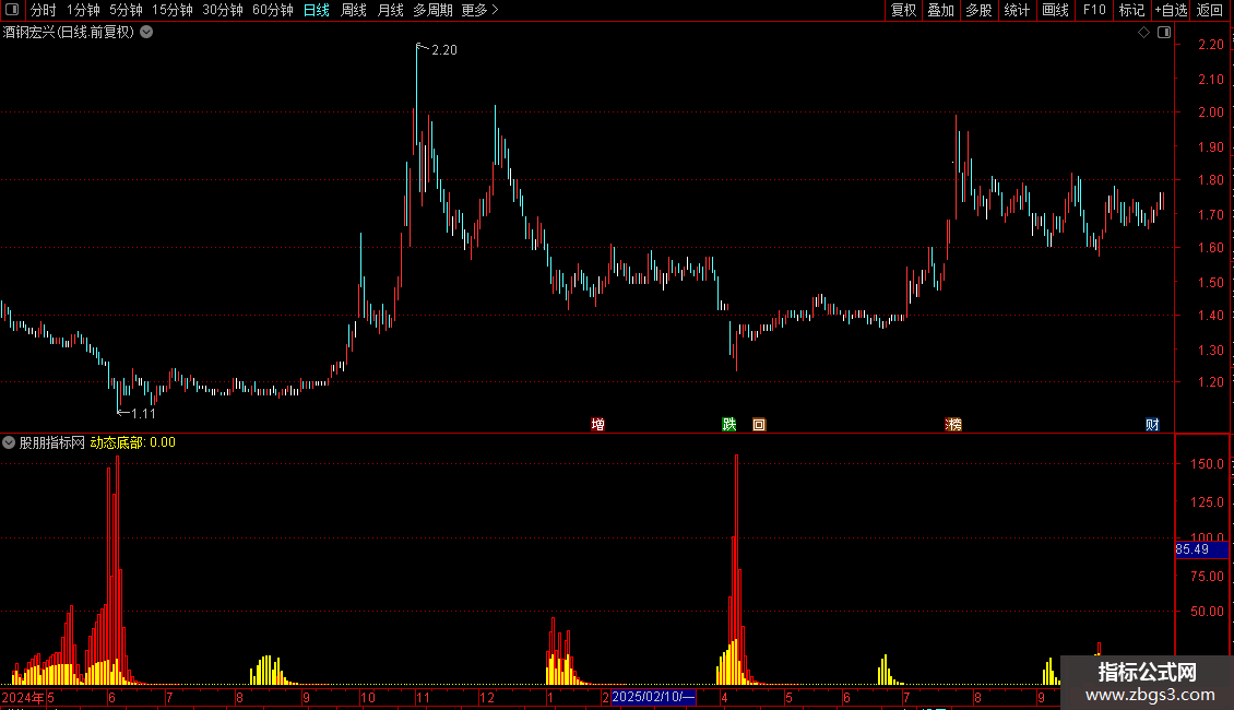 动态底部:EMA(IF(L<= LLV(L,30),SMA(ABS(L-REF(L,1)),30,1)/SMA(MAX(L-REF(L,1),0),30,1),0),3)*10,STICK,COLORYELLOW,LINETHICK2;