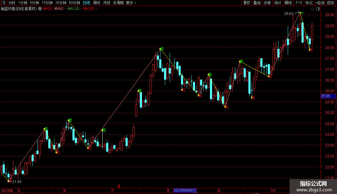 趋势高:PLOYLINE(DISP=3,ZIG(1,K*N1)),COLORLIBLUE;