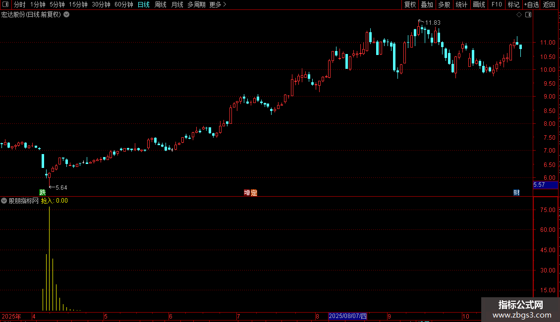 抢入:EMA(IF(LOW<=VARE,(VARD+VARF*2)/2,0),3)/618*VAR10,COLORYELLOW,STICK;