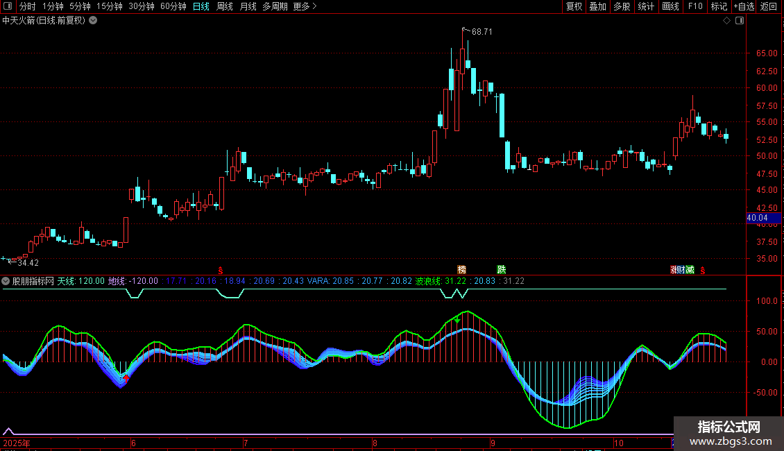 波浪线:SMA((VAR11-50)*2,3,1)+SMA((VAR10-50)*2,3,1)/2,LINETHICK2,COLORGREEN;