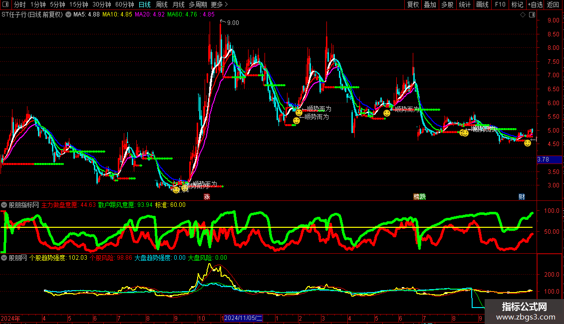 主力做盘意愿:WINNER(MA(CLOSE,5))*100,LINETHICK5,COLORRED;