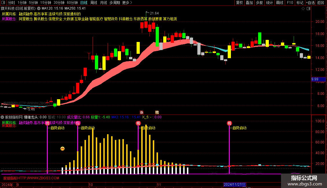 2.主图大阳线站上趋势线,叠加副图趋势启动信号,代表主升浪阶段或已开启