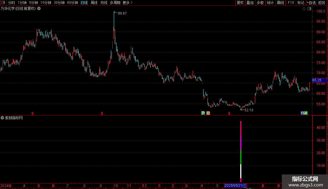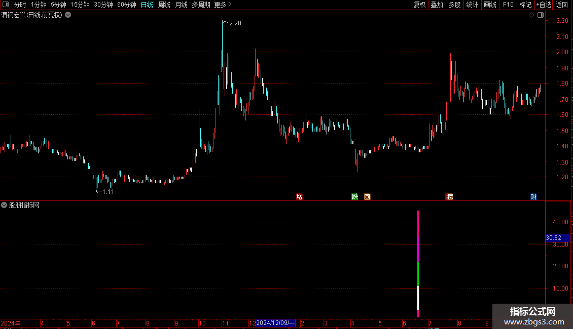 ZBGS7赋值:如果最低价<=ZBGS4,返回(ZBGS3+ZBGS5*2)/2,否则返回0的3日指数移动平均/618*ZBGS6