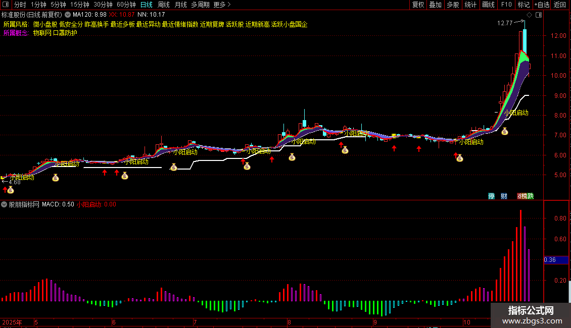 2.核心逻辑解析:主图小阳启动信号与副图红色量能柱形成双重验证。首次共振时,量能柱变红且主图出现启动信号,