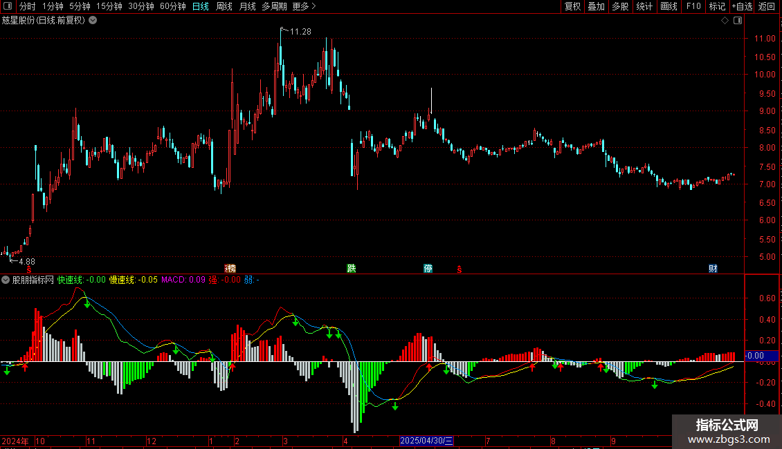 3、快速线突破零轴标示有红色箭头,这个红色的箭头具有特别的的意义,是神渔智能交易系统中可操作的前置指标,是和神渔智能交易系统的买点指标协调使用的,非常重要。