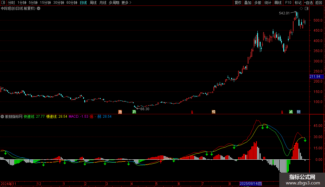 1、指标数值改为快速线、慢速线以及表示强弱程度;并且代表强弱的柱子加粗,观察更显眼,更轻松;