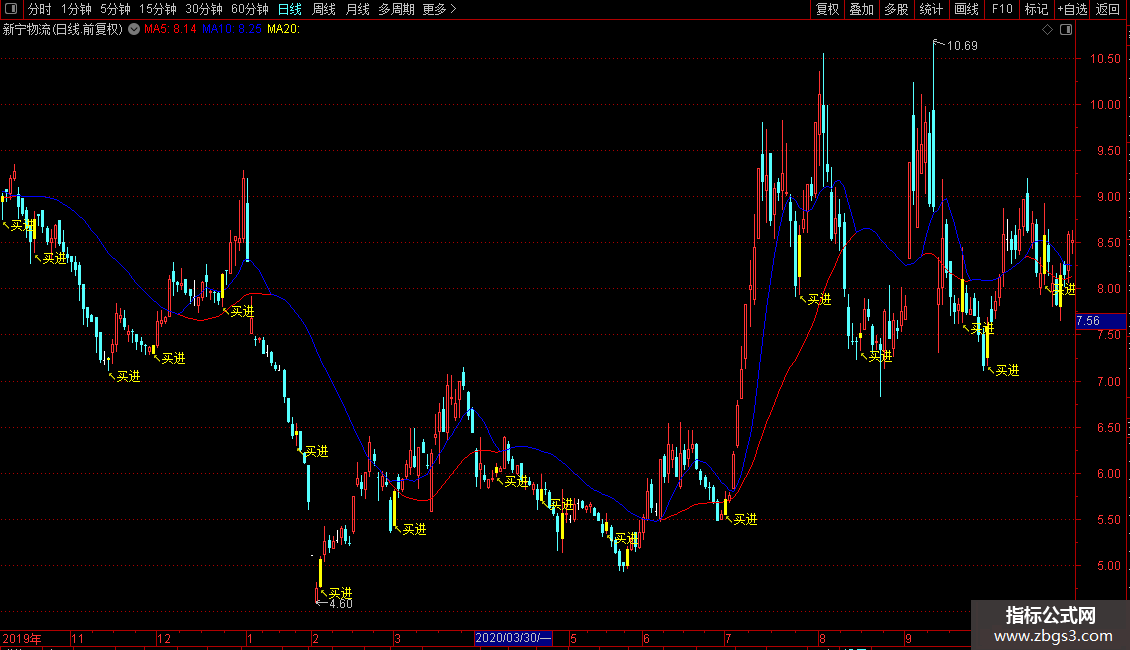 DRAWTEXT(FILTER(买=1,5),LOW-0.05,'↖买进'),COLORYELLOW;