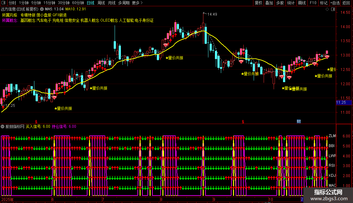 指标通过整合MACD、KDJ、RSI、LWR、BBI和动量指标,实现多指标共振判断买卖点。当所有指标同时发出金叉信号时,产生买入信号;持续满足条件则显示持仓信号。
