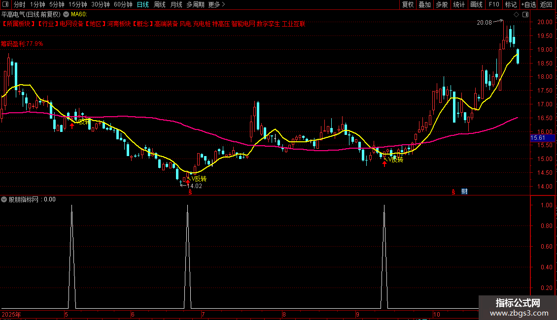 指标包含主、副及选公式,专为捕捉股价趋势V型转折设计,适用于通达信软件,可直接用于选或预警。主图核心展示生命线与趋势线:生命线作为多空分界参考,趋势线动态跟踪运行方向,当趋势线出现转向拐点时,主图会同步标注“V反转”信号,直观提示潜在转折机会。