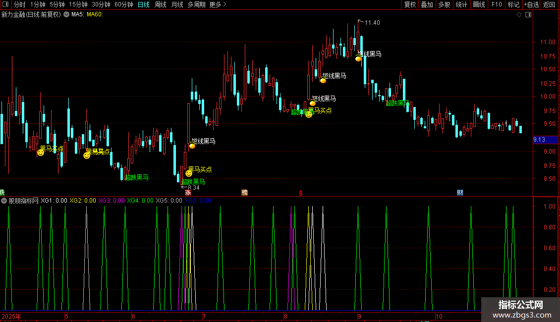指标通过多组均线交叉、动量强度和超跌反弹信号,识别股票短期强势起涨点。当短期均线上穿中长期均线且成交量放大时提示"黑马买点";在价格超跌区域结合动量反转捕捉"超跌黑马"机会;综合量价、波动率和趋势强度筛选出"大黑马"标的。