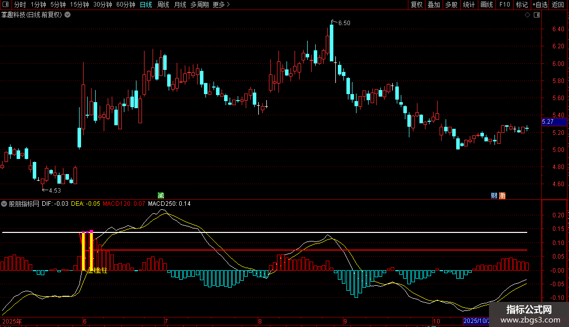 DIF:EMA(CLOSE,12)-EMA(CLOSE,25);DEA:EMA(DIF,5);MACD:=(DIF-DEA)*2;STICKLINE(MACD>0,MACD,0,3,1),COLORRED;STICKLINE(MACD<0,MACD,0,3,1),COLORCYAN;MACD120:REF(MACD/2,BARSLAST(MACD=HHV(MACD,120))),COLORRED,LINETHICK2;MACD250:REF(MACD/2,BARSLAST(MACD=HHV(MACD,250))),COLORWHITE,LINETHICK2;XG:=NOT(REF(MACD120,1)=MACD120);STICKLINE(XG,0,MACD,2,0),COLORYELLOW;STICKLINE(MACD>=MACD250,MACD250,MACD,2,0),COLORMAGENTA;大行情:=NOT(REF(MACD120,1)=REF(MACD250,1)) AND MACD120=MACD250;DRAWTEXT(XG,0,'↖金柱'),COLORYELLOW;DRAWTEXT(大行情,0,'↖大牛启动'),COLORYELLOW;