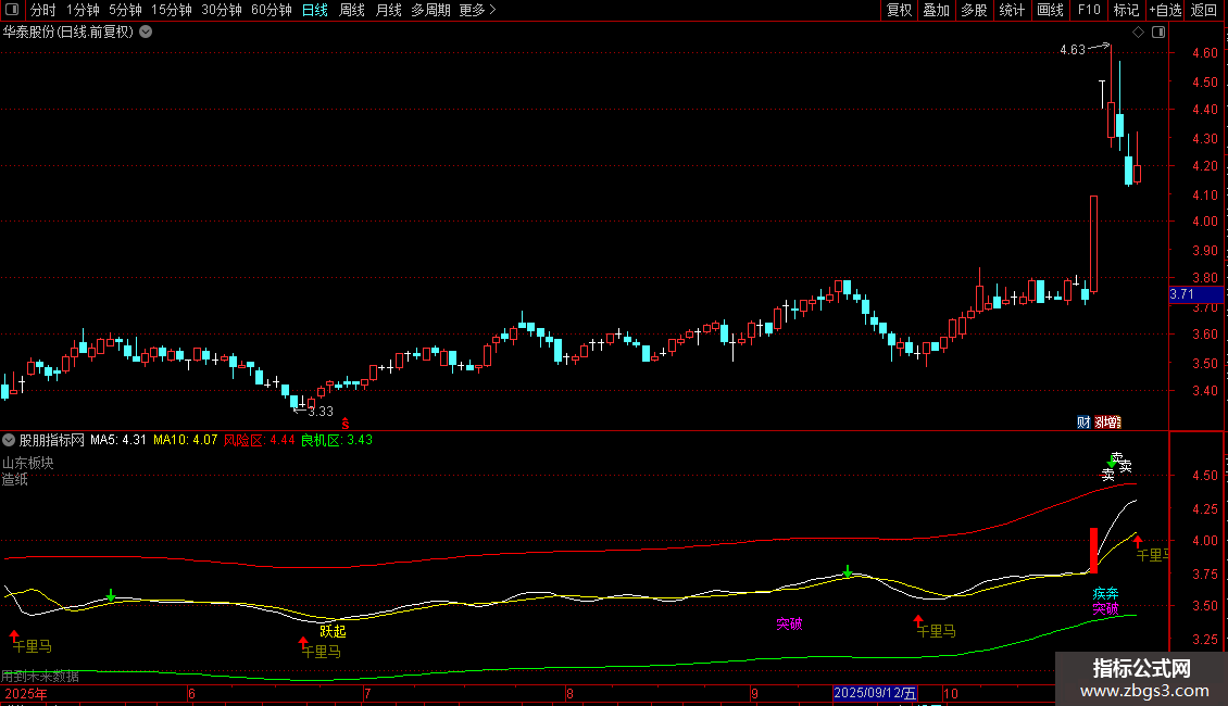 DRAWTEXT((ZIG(3,5)>REF(ZIG(3,5),1)) AND (REF(ZIG(3,5),1)<=REF(ZIG(3,5),2)) AND (REF(ZIG(3,5),2)<=REF(ZIG(3,5),3)),LOW*0.94,'千里马'),COLORBROWN;
