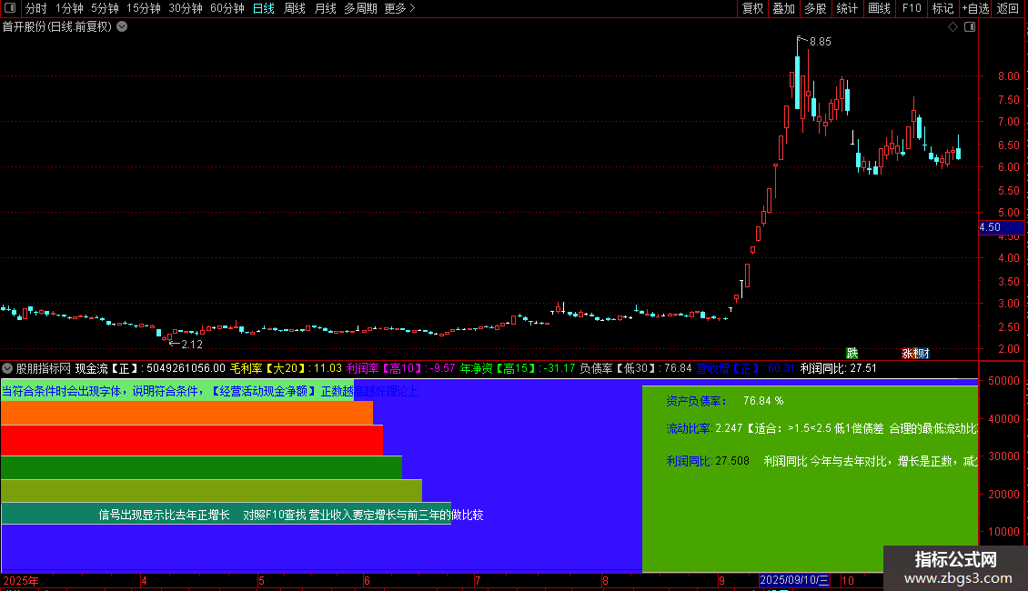 DRAWTEXT_FIX(现金流【正】>0,0,0.03,0,'当符合条件时会出现字体,说明符合条件,【经营活动现金净额】 正数越高越好理论上')COLORBLUE ;