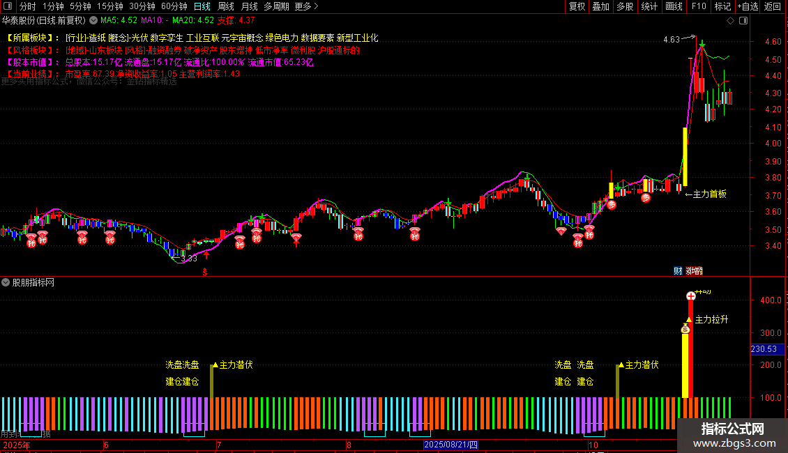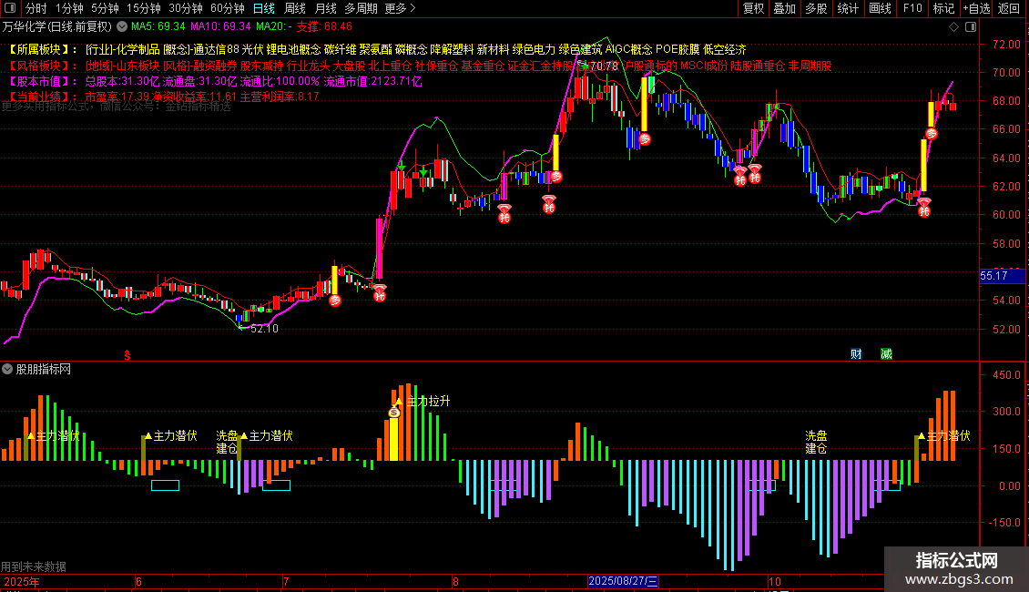 主要功能:通过多重技术指标综合判断股票买卖时机。它融合了价格趋势、动量变化、超买超卖状态和主力资金动向等多维度信号,在不同阶段给出明确的建仓、洗盘、主力潜伏等提示。