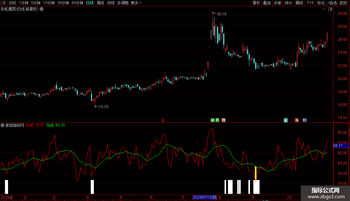 牛线:SMA(MAX(CLOSE-REF(CLOSE,1),0),N,1)/SMA(ABS(CLOSE-REF(CLOSE,1)),N,1)*100,COLORRED;