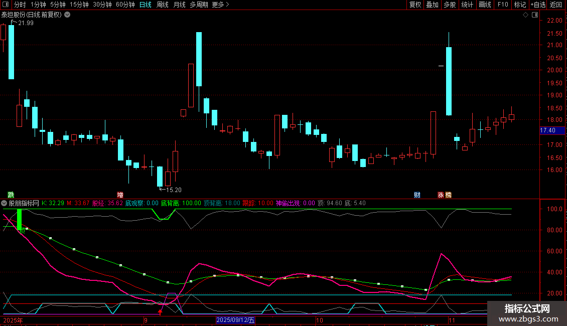 底背离: IF((VAR26<10),90,100), COLORGREEN,LINETHICK2;