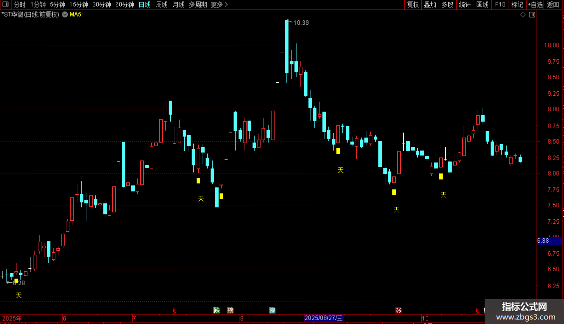DRAWTEXT(FILTER(天=1,5),LOW*0.95,'天'),COLORYELLOW;