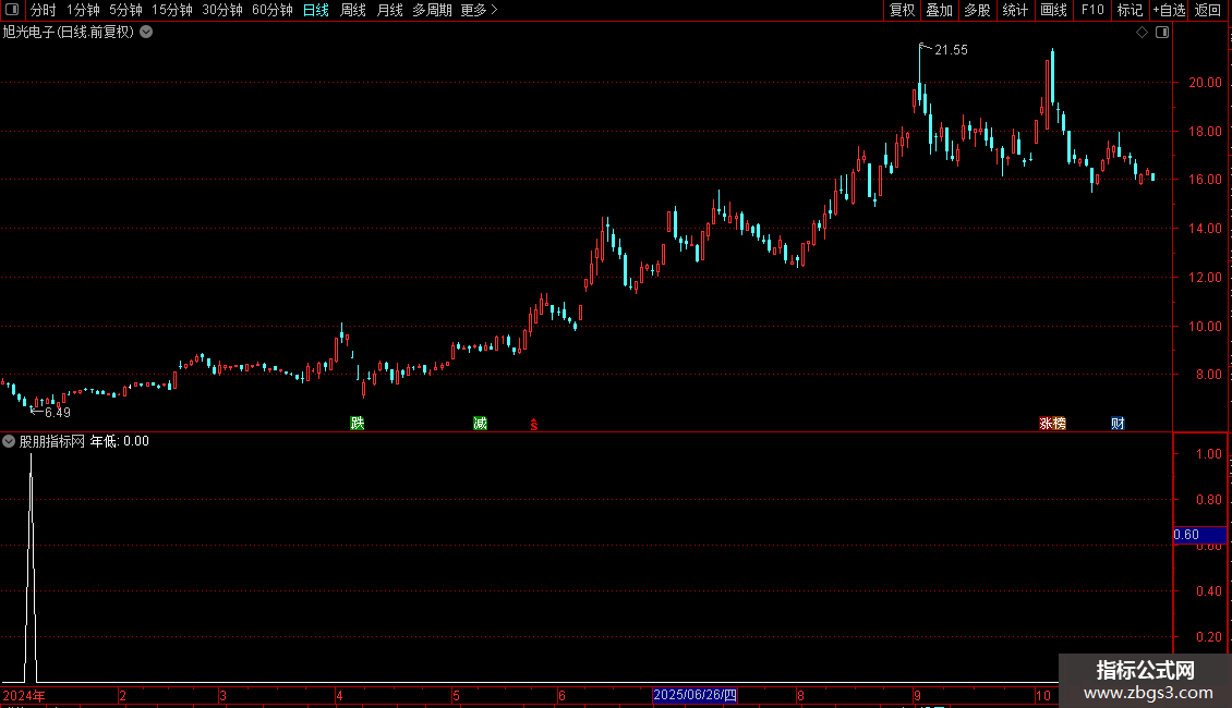 今天这个【年度新低】不是什么神器,也不是买卖信号,更不是分析用的指标 但是确实是一个指标,可以用作特定特征选股搜索工具使用。 【年度新低】符合反应现象当前一年内股价新低位置,这个低点位置是以年计算,也就是假设年交易天数为250天 只代表当前看到的新低点不代表明日以后可能出现的新低。 发这个目的是引导新人研究指标多从理论知识出发,去思考要编写指标去解决那种问题去反应那种现象。 这个【年度新低】作为一个小常识编写小技巧科普供大家参考 指标其实很简单,两句话的事。当知识积累到了,很多东西编写其实是会很精炼。 知识在于平时积累在于多看图多总结。 年:=REFDATE(LLV(L,250),DATE); 年低:年=L AND ((C-L)>(0-C) OR (O-L)>(C-O));