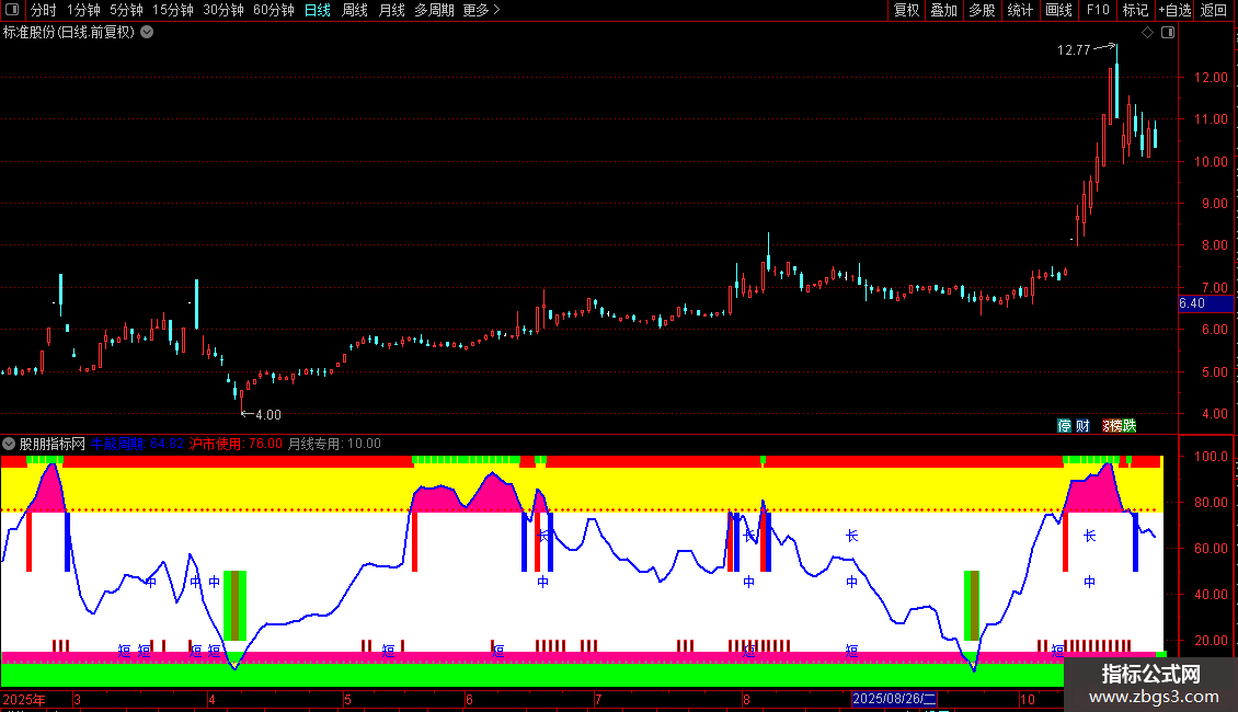 操作策略‌:当指标线从低位上穿关键水平时,视为买入信号;当指标线从高位下穿关键水平时,视为卖出信号。同时,均线系统呈现多头排列时,会标注“短”、“中”、“长”等字样,提示不同周期的趋势启动。‌