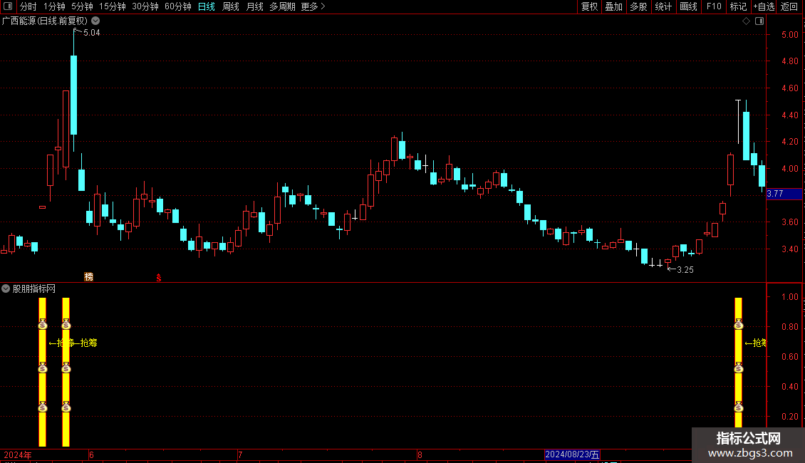 副图黄色柱子现钱袋子信号,标志擒龙指标主力介入启动,此时主力有强力拉升意图,需结合热门概念综合判断提升胜率。