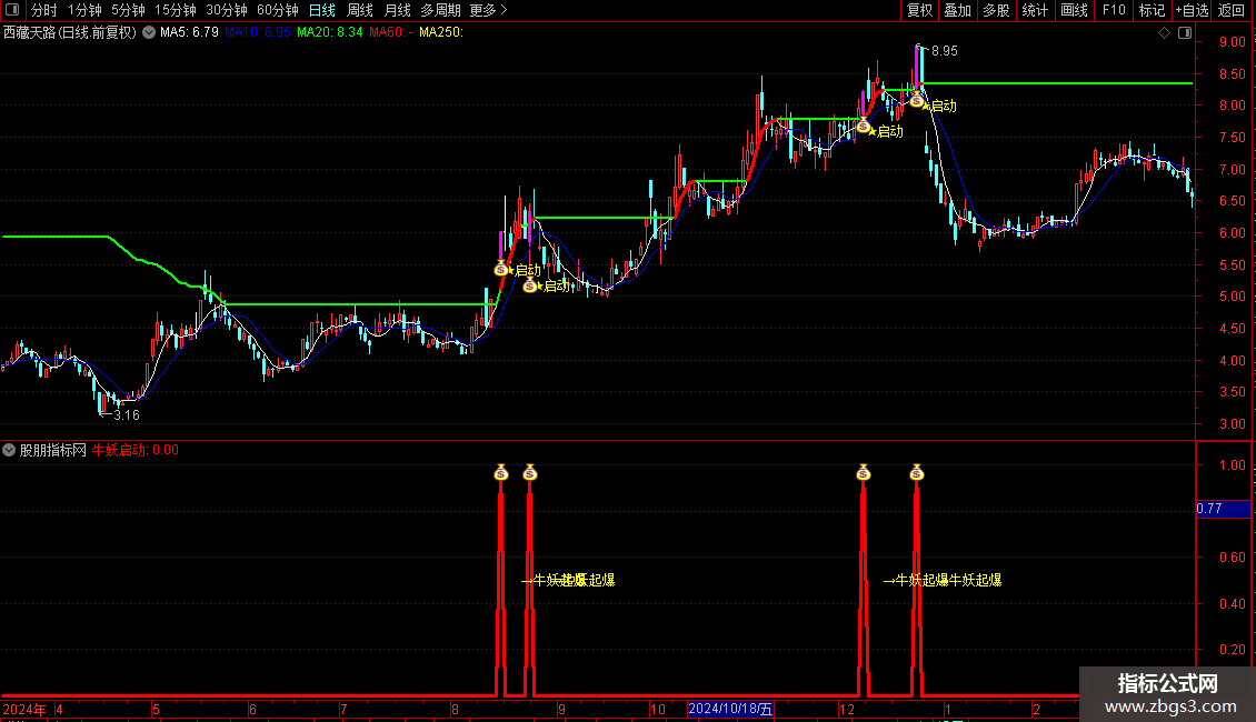 操作策略:当“牛妖启动”信号出现且当日收阳线时,视为潜在买入机会。 该信号需结合价格突破长期趋势线、特定K线组合(如前期大阳线+当前小实体阳线)共同确认。