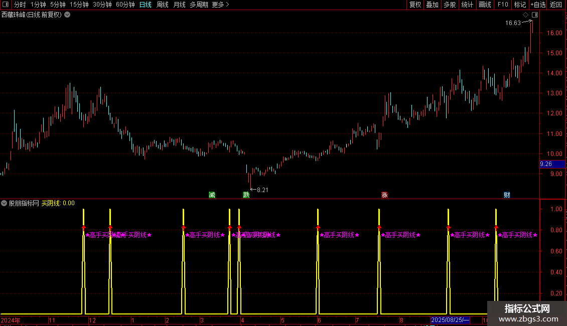 指标通过短期和长期均线的关系、价格在近期波动区间的位置,以及成交量均价的偏离度来识别买入机会。当短期均线下穿长期均线后,结合股价处于相对低位且收盘价低于均价时,在次日出现阴线且创前日新低时发出买入信号。