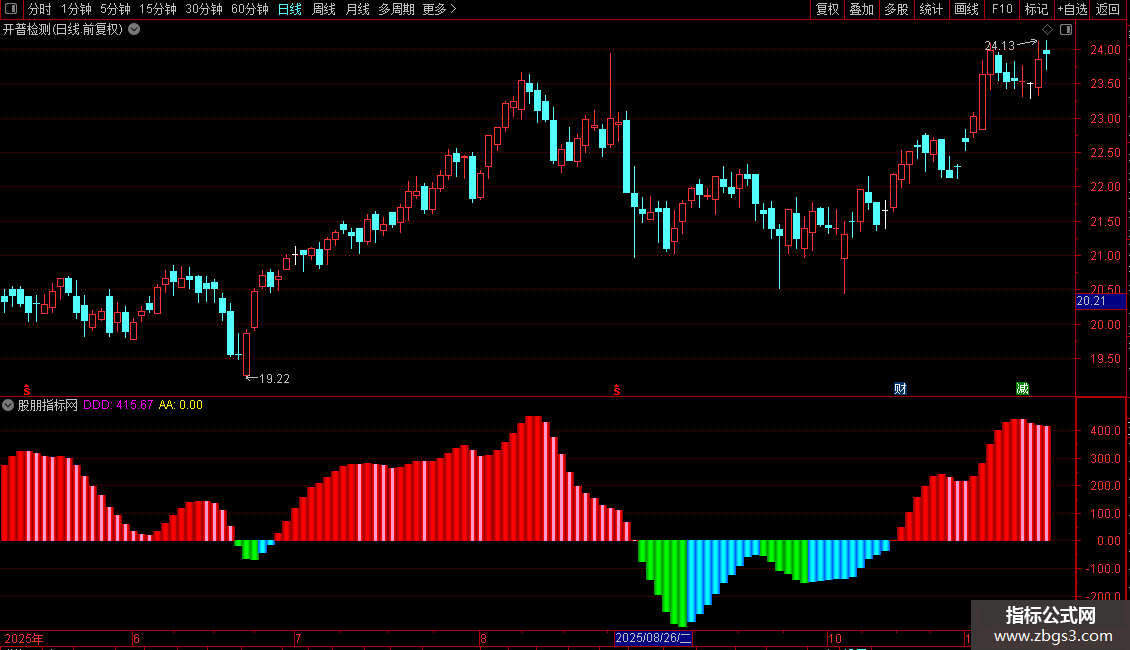 当满足条件VAR2>50ANDCOST(60)0时,在主力和0位置之间画柱状线,宽度为3,0不为0则画空心柱.,COLOR0000BB