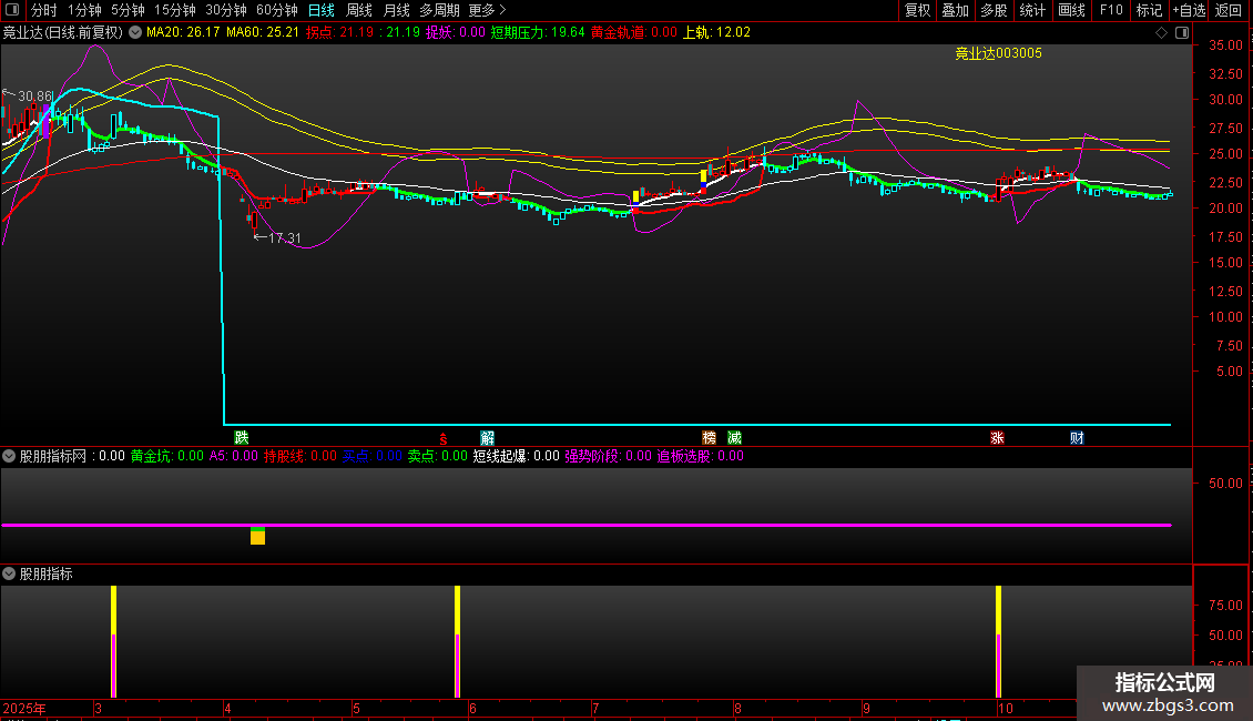 强势阶段:IF(EMA(CLOSE,2)>HHV(EMA(CLOSE,5),26) AND A5>0*X_4,持股线,0),COLORMAGENTA,LINETHICK3;