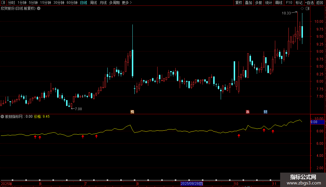 当趋势强度突破其均线且随机指标的慢线开始拐头向上时,标记买入信号。