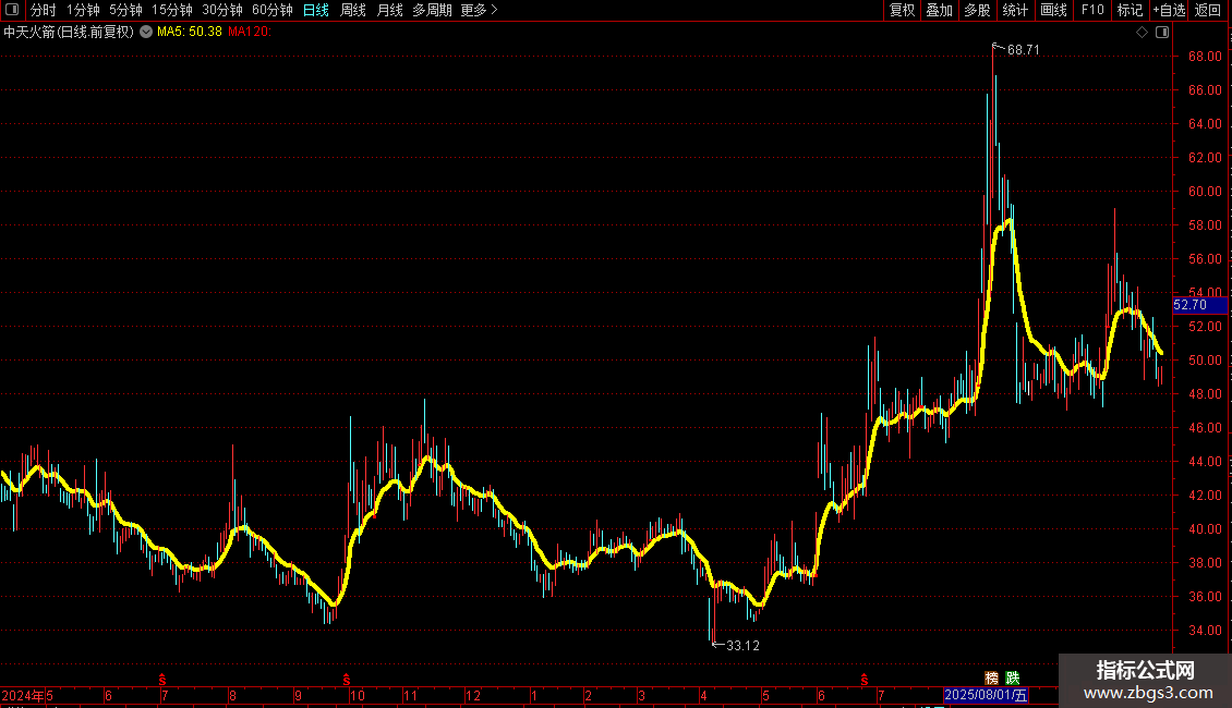 趋势线:(MA(C,3)+MA(C,6)+MA(C,12)+MA(C,24))/4,COLORYELLOW,LINETHICK4;
