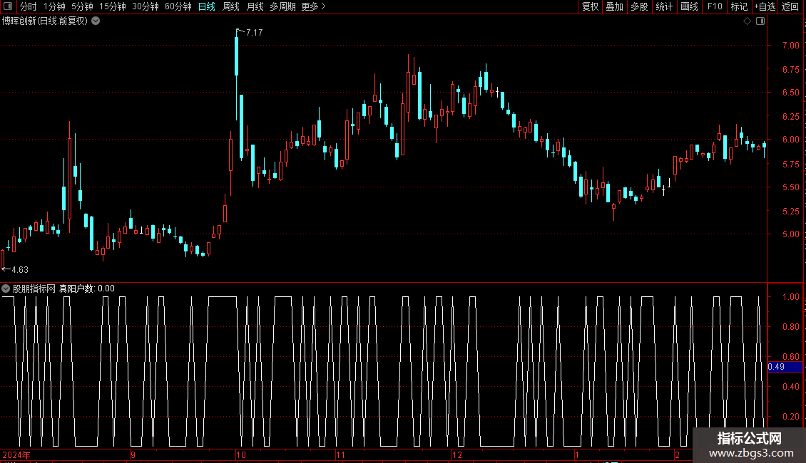 运行时,在副图点击板块每日真阳及假阴真阳之占比BKMRZYZB,耐心等5~10分钟,即能见到沪深A股的每日所有真阳(已排除假阳真阴、但包括假阴真阳)数占沪深涨跌股总数之占比。但请注意:启动该指标后,因计算量巨大,系统会统计计算长达5~10分钟之久,须耐心等待出最终结果。