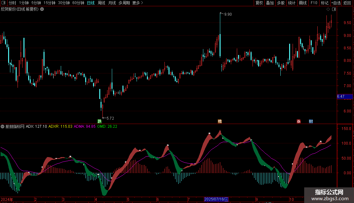 OMD:(ADX-2*ADMA+ADXR)/2, COLORSTICK;