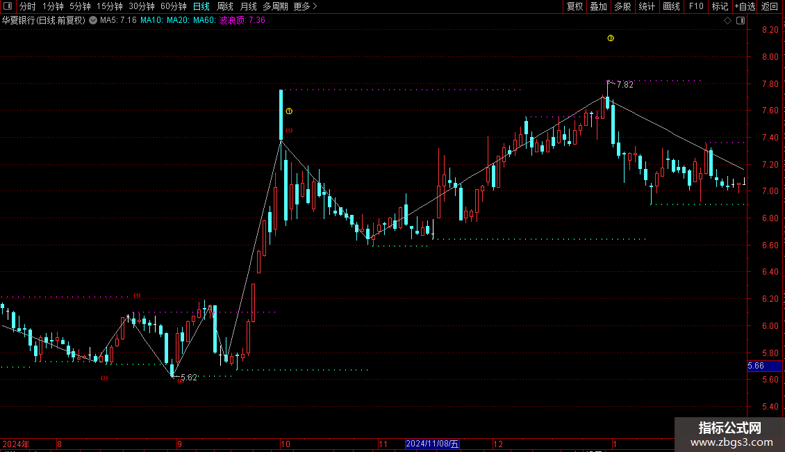 波浪顶:IF(T1,A,A),COLORFF00FF,POINTDOT,LINETHICK2;
