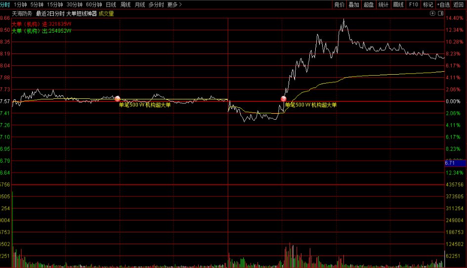 这款分时主图指标专注于捕捉大额资金动向,尤其适合短线交易参考。它实时统计并显示机构级别的大单进出金额,以万元为单位分别呈现买入与卖出规模,帮助使用者快速把握主力资金流向。同时,指标会自动标记盘中出现的特定技术形态转折点,当满足预设条件时,会在价格附近提示关注信号,并标注“机构超大单”等说明文字。通过直观展示大单活跃度与关键时点,为使用者在分时走势中判断短期强弱、把握交易时机提供清晰的辅助依据。