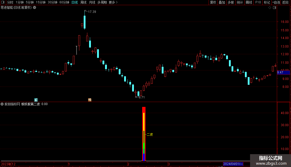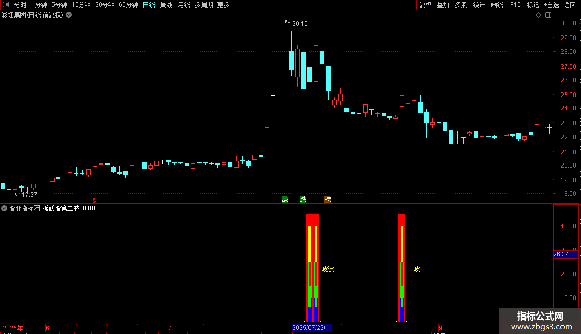 共振触发二波信号:上述条件同时满足时,标记为“板妖股第二波”——在图表上以多色柱与显眼文字提示(便于盘中快速识别)。